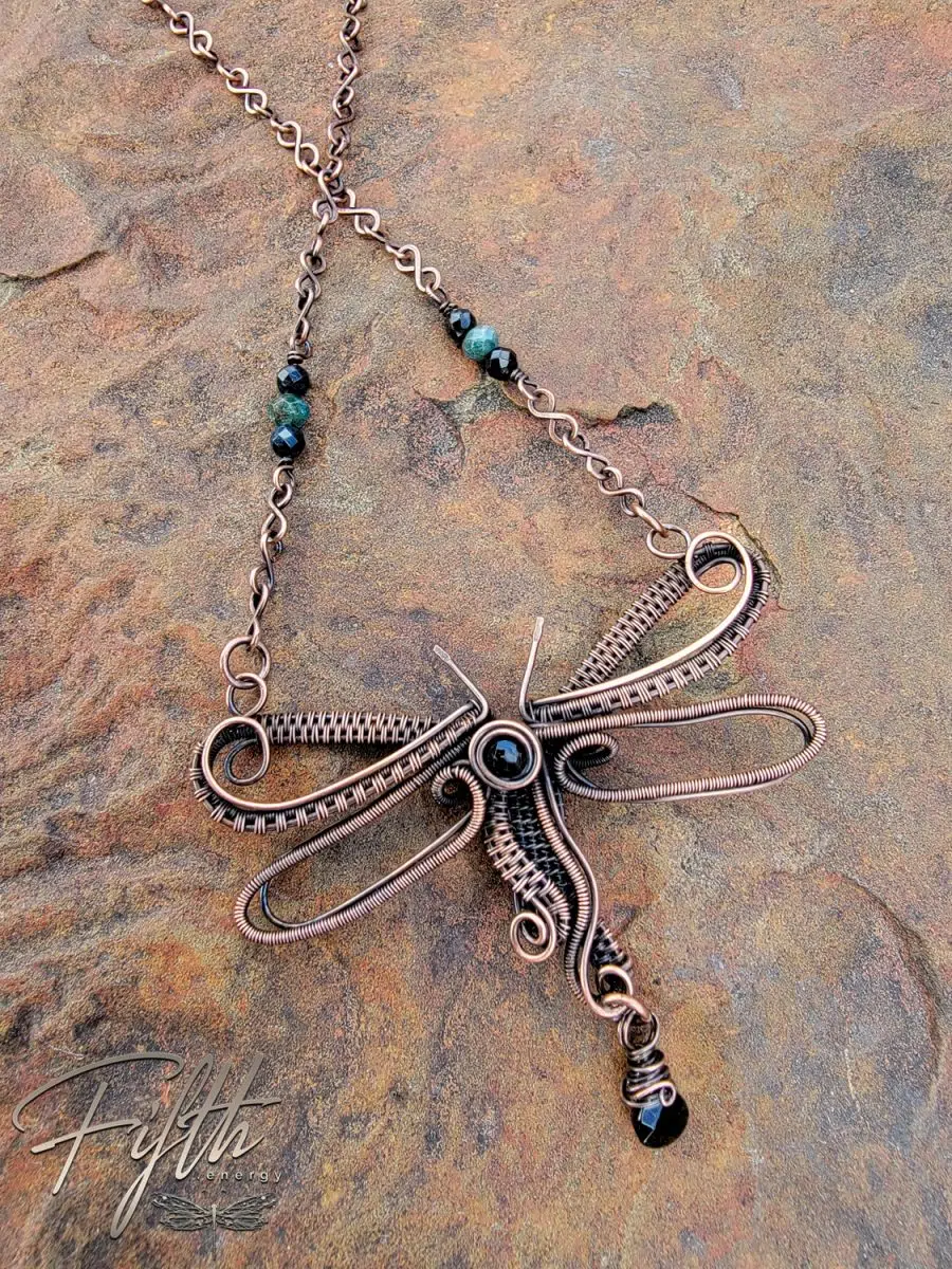 Black Tourmaline & Copper Dragonfly Choker, including the chain has been patinaed & polished to accentuate the detail, then coated to prevent tarnish.