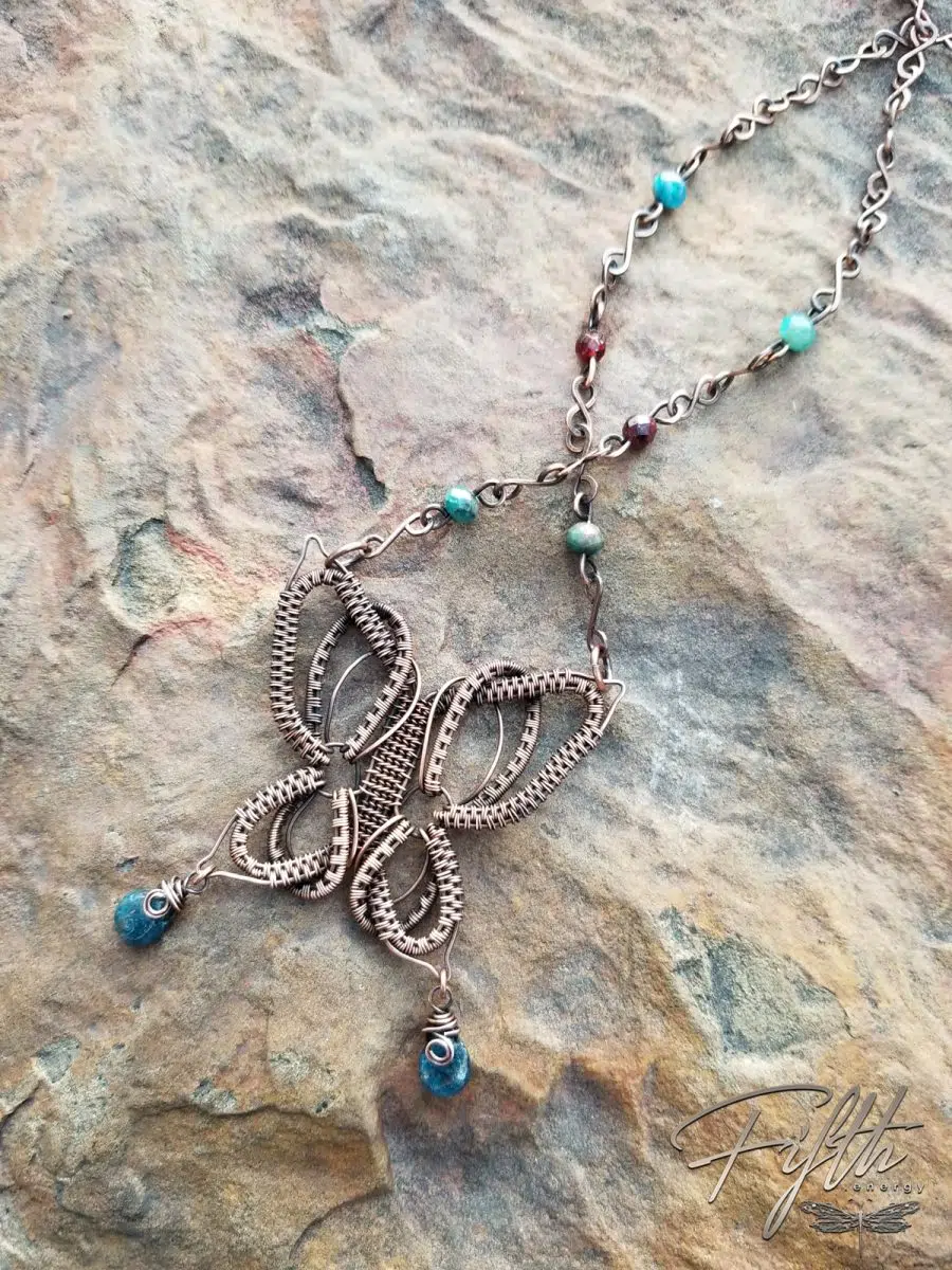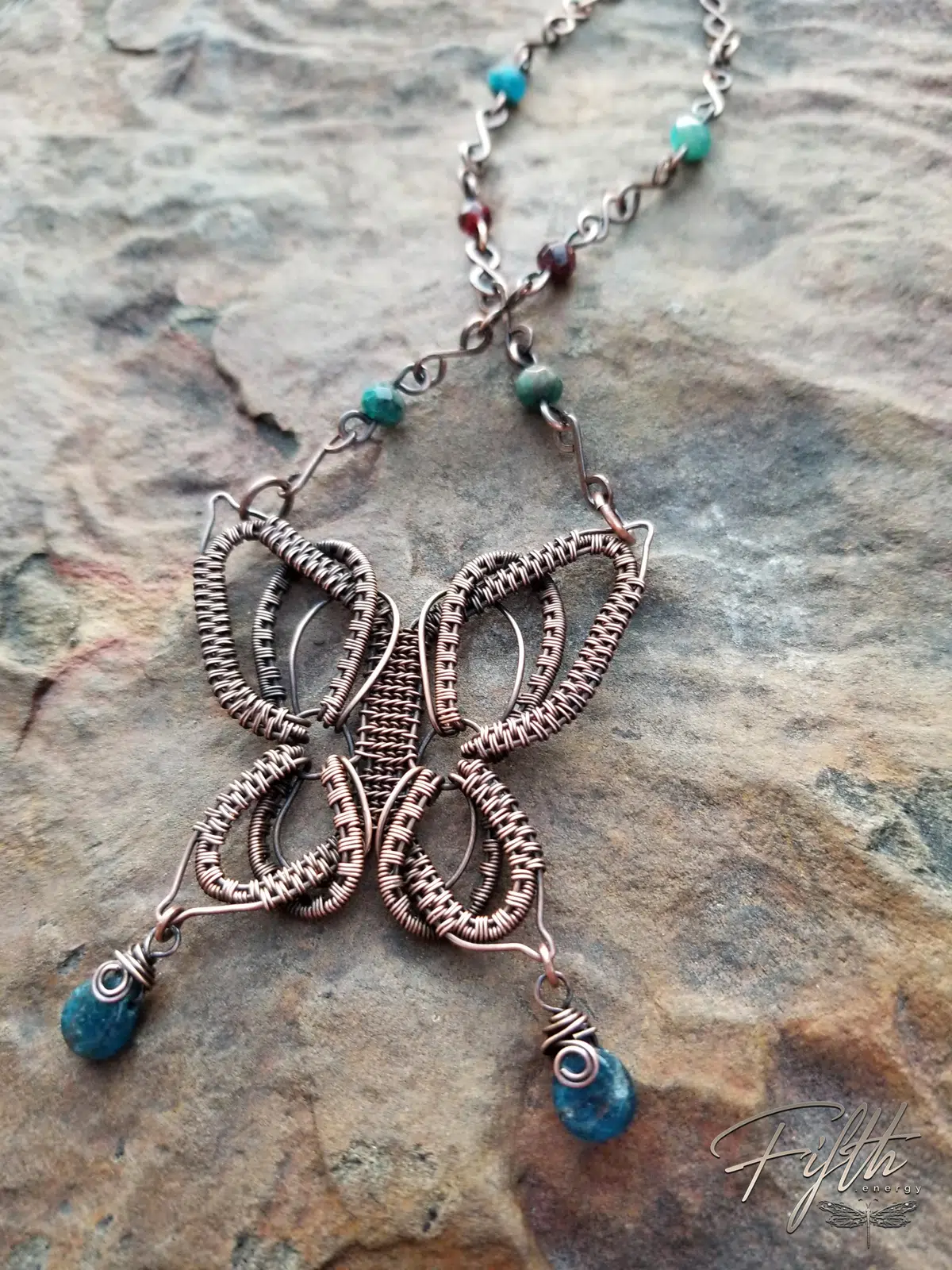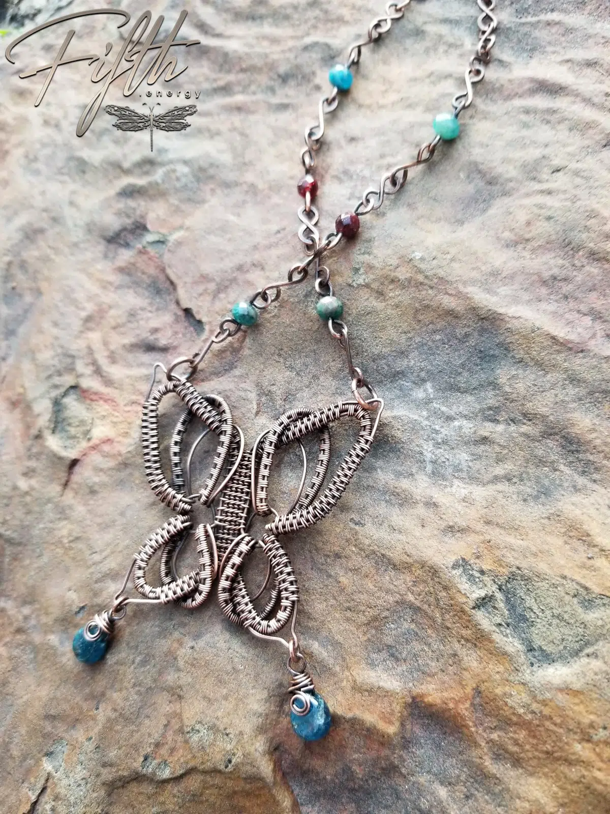 Butterfly with Apatite Gemstones Necklace is handcrafted from pure raw copper made in the USA. The pure raw copper Butterfly necklace includes 2- 8x6mm teardrop Apatite Gemstones & chain features 4 – 5mm faceted A Grade Apatite Gemstones & two 4mm faceted A Grade Garnet Gemstones.