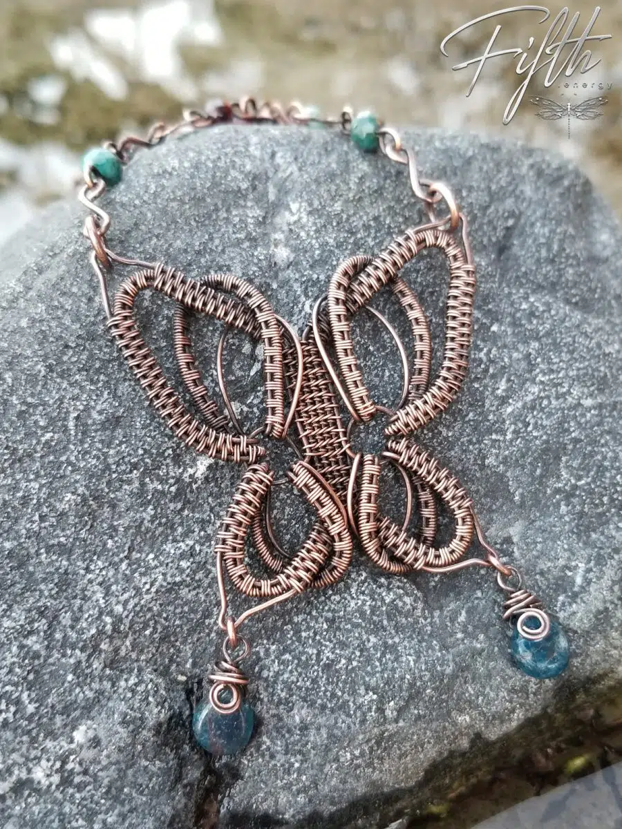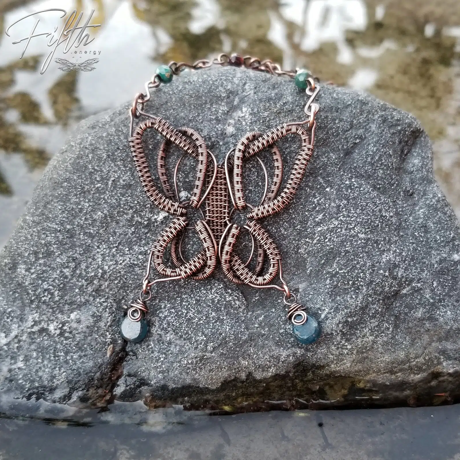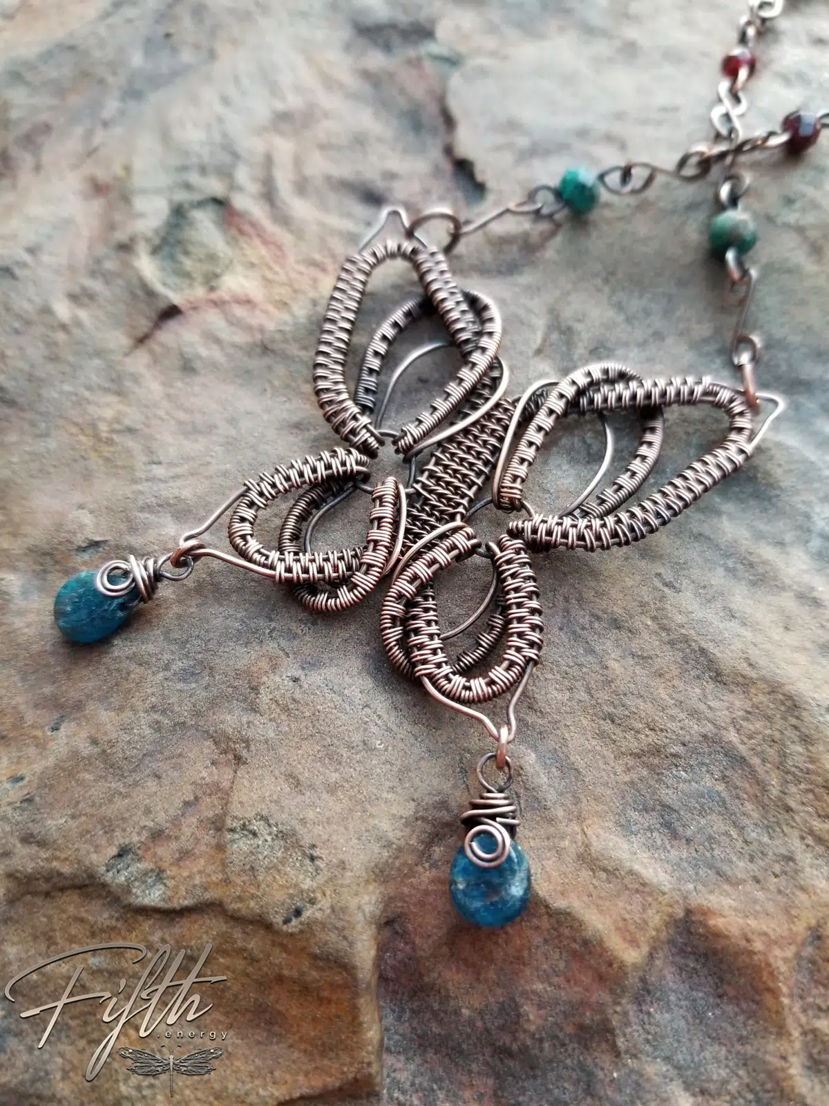 Butterfly with Apatite Gemstones Necklace is handcrafted from pure raw copper made in the USA. The pure raw copper Butterfly necklace includes 2- 8x6mm teardrop Apatite Gemstones & chain features 4 – 5mm faceted A Grade Apatite Gemstones & two 4mm faceted A Grade Garnet Gemstones.