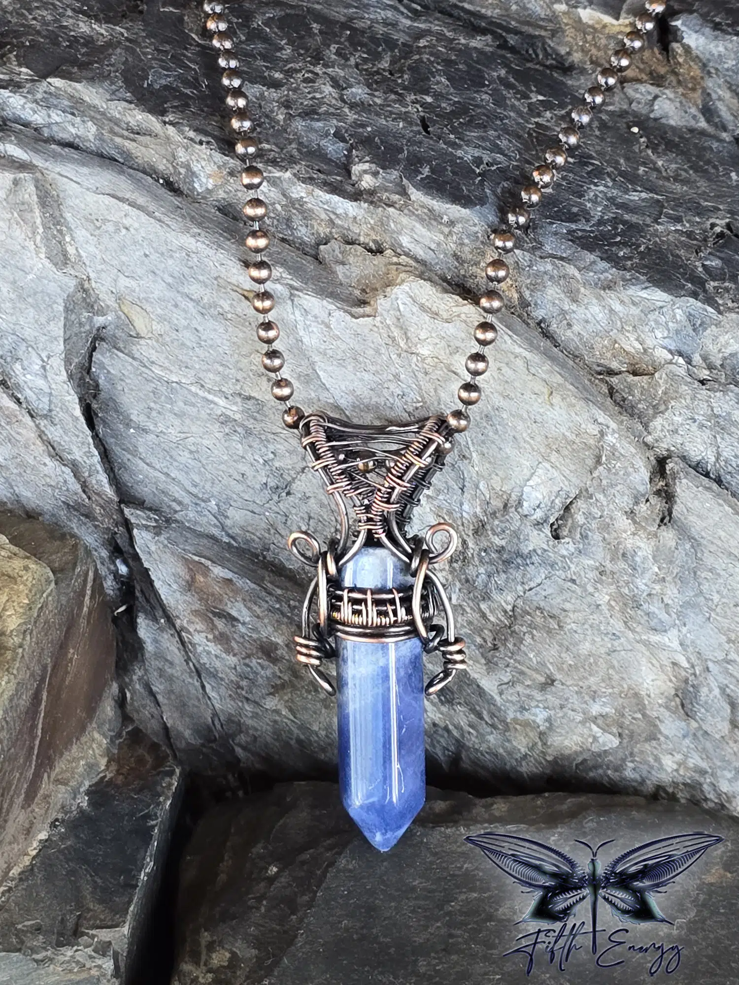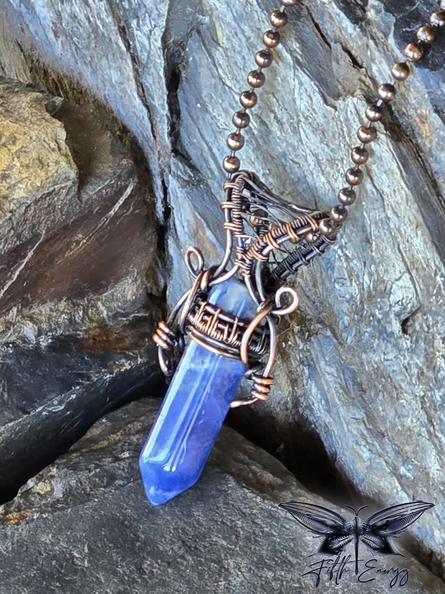 Mens Sodalite Amulet Gemstone Point pendant is wrapped in American made, pure raw copper. The hexagonal-shaped Sodalite gemstone is 100% natural, non-dyed, no heat treatment.  Pendant includes 30″ real copper ball chain that can be cut to your preferred size. Entire piece including the chain has been patinaed and polished to accentuate the detail, then coated to prevent tarnish.