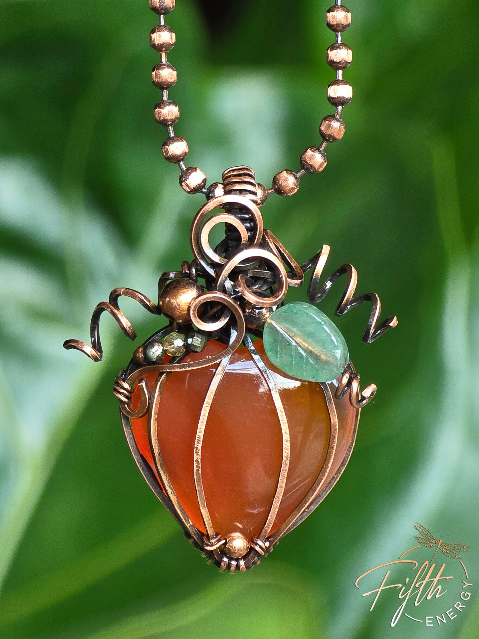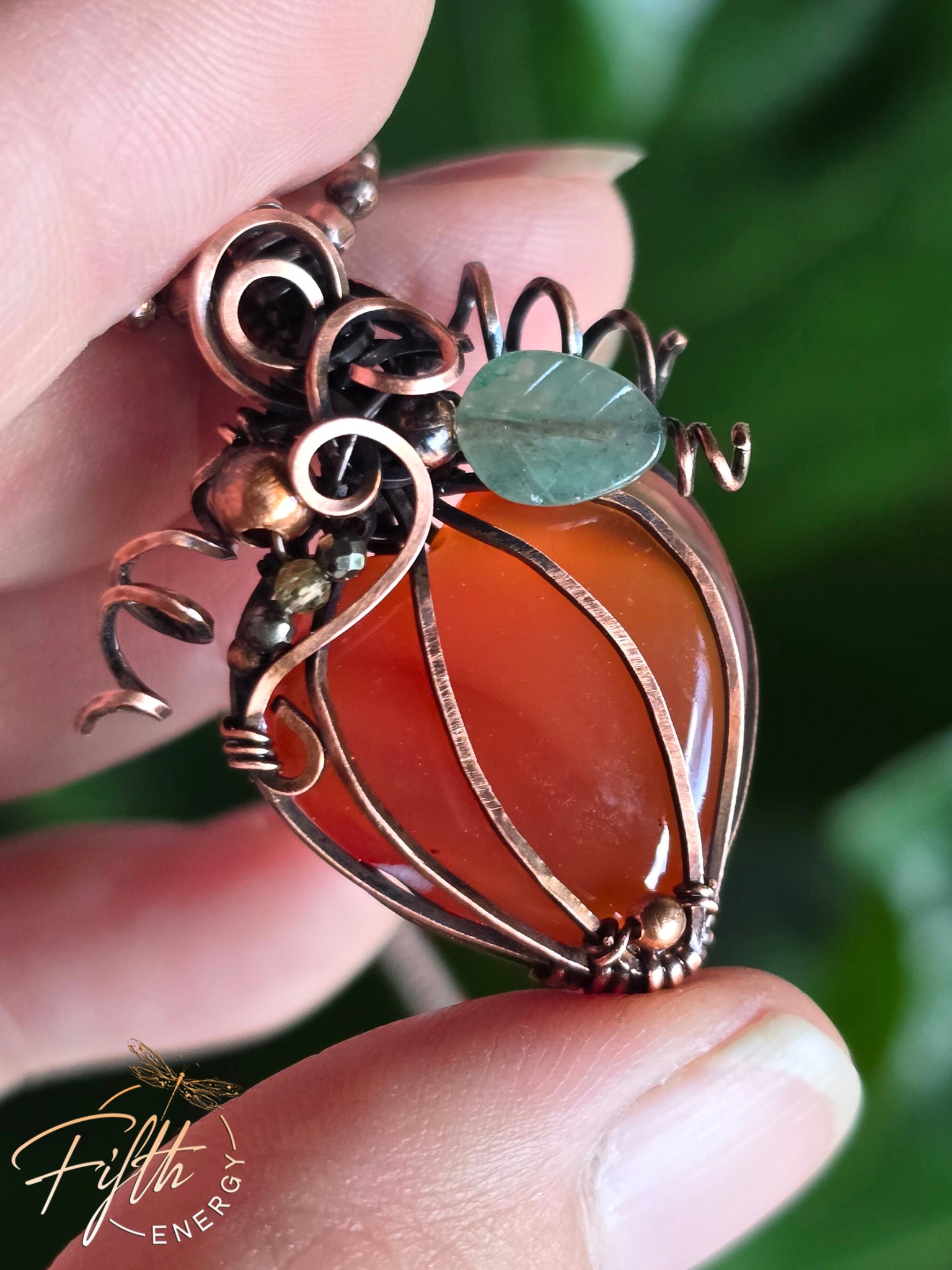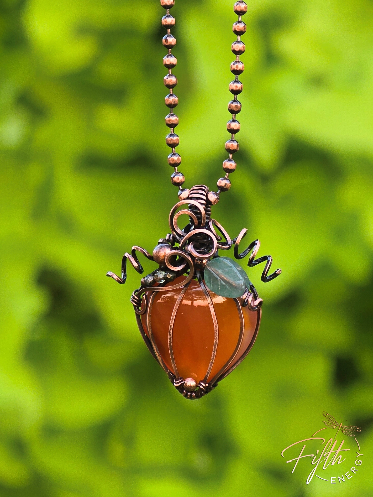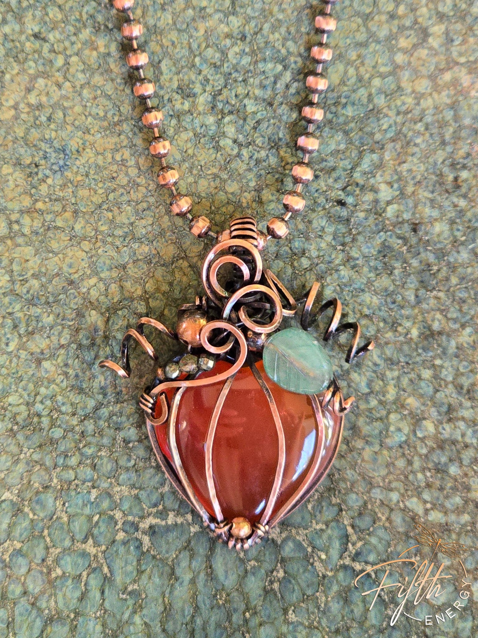 Celebrate the season with this Mini Carnelian Pumpkin Pendant, hand-carved from genuine Carnelian gemstone in a sweet heart shape and paired with a delicate Aventurine leaf accent. The pendant hangs from an 18-inch solid copper ball chain, crafted in the USA and easily adjustable to your ideal length. Each chain is coated to maintain its rich shine, prevent tarnish, and ensure comfort against skin and fabric. Whether worn on its original chain or swapped onto your favorite cord or necklace, this playful yet elegant piece brings a touch of autumn warmth to any style.