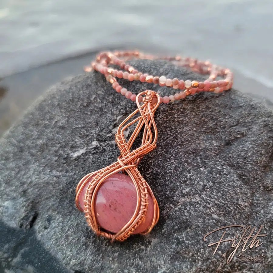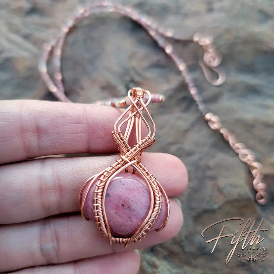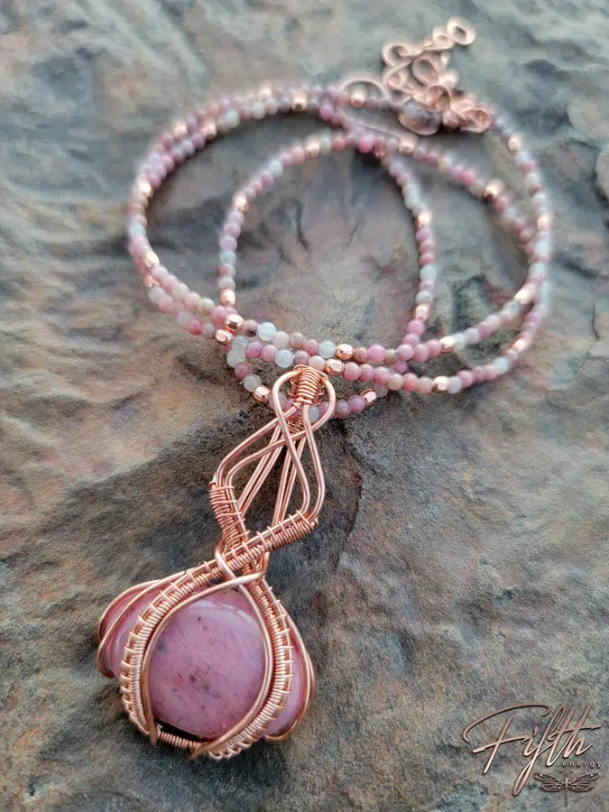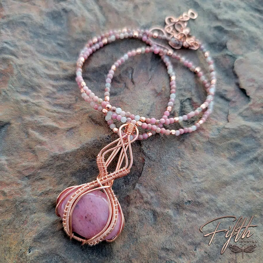 Pretty in Pink Rhodonite Necklace features a Rhodonite gemstone wrapped in pure raw copper. Pendant includes an 19.5″ long beaded Rhodonite and copper necklace adjustable to 21″. Pendant can easily be used with other chains.