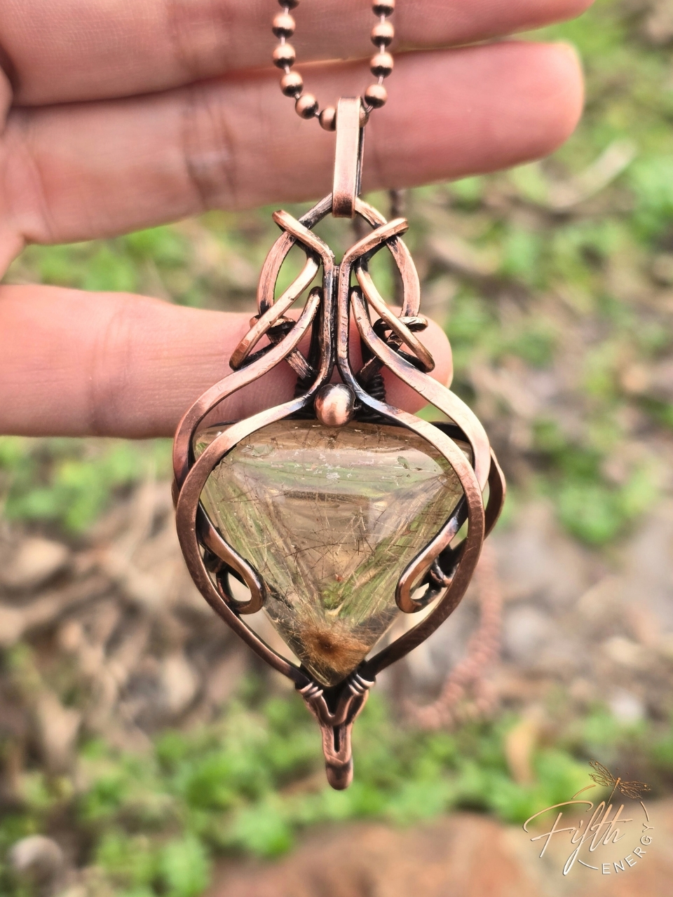 This one-of-a-kind rutilated quartz copper encased necklace is entirely handcrafted using pure, American-made raw copper. The natural rutilated quartz gemstone is 100% genuine, never dyed, heated, or treated, allowing its golden rutile inclusions to remain just as nature formed them.