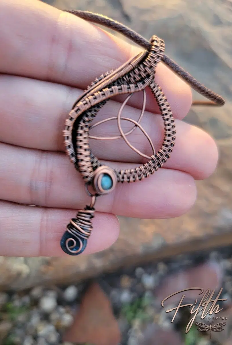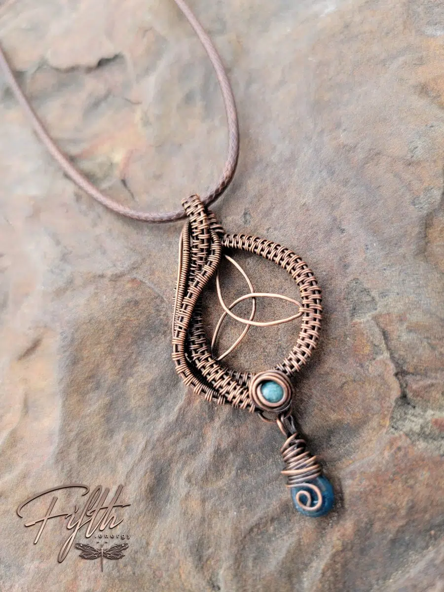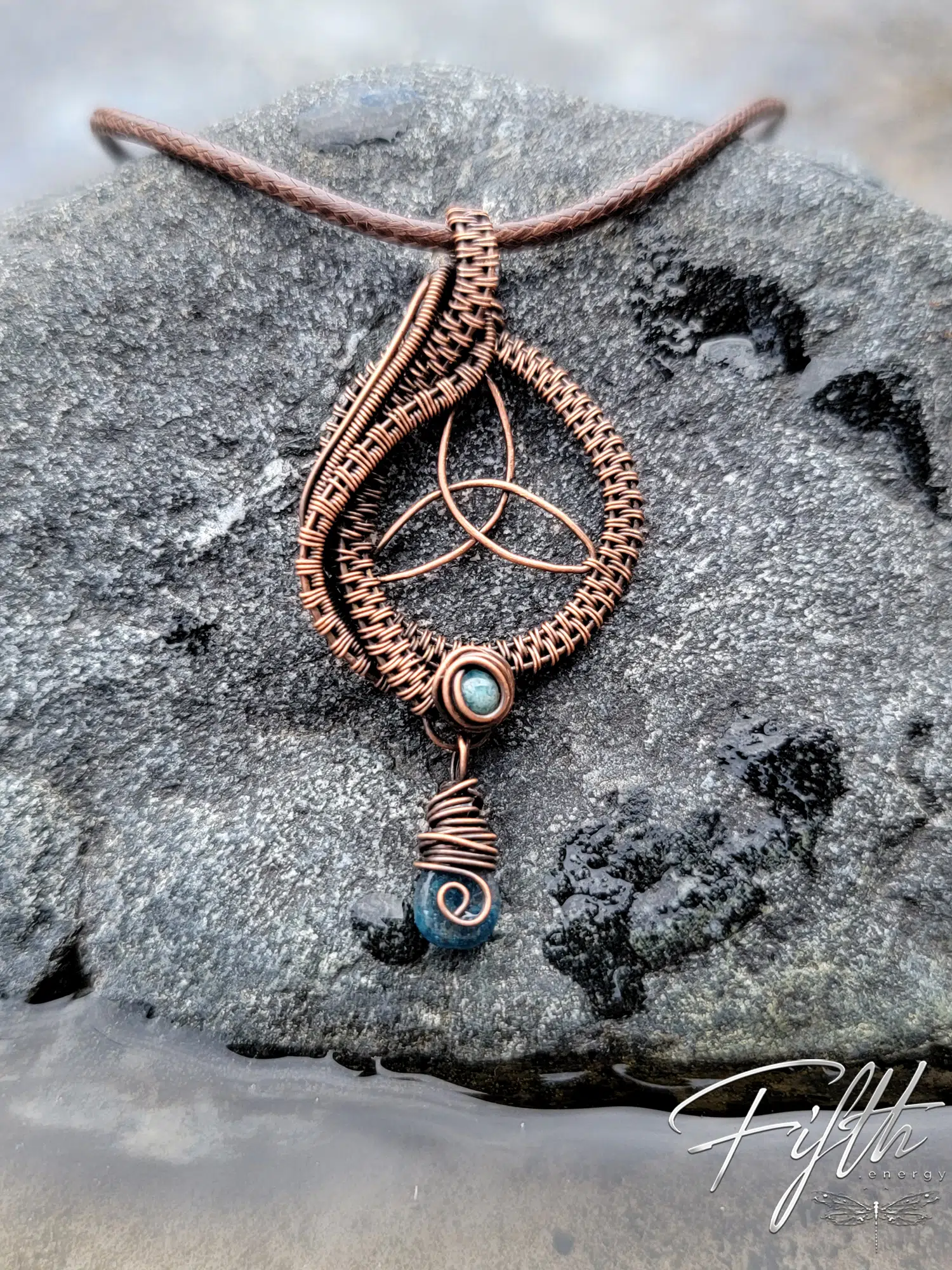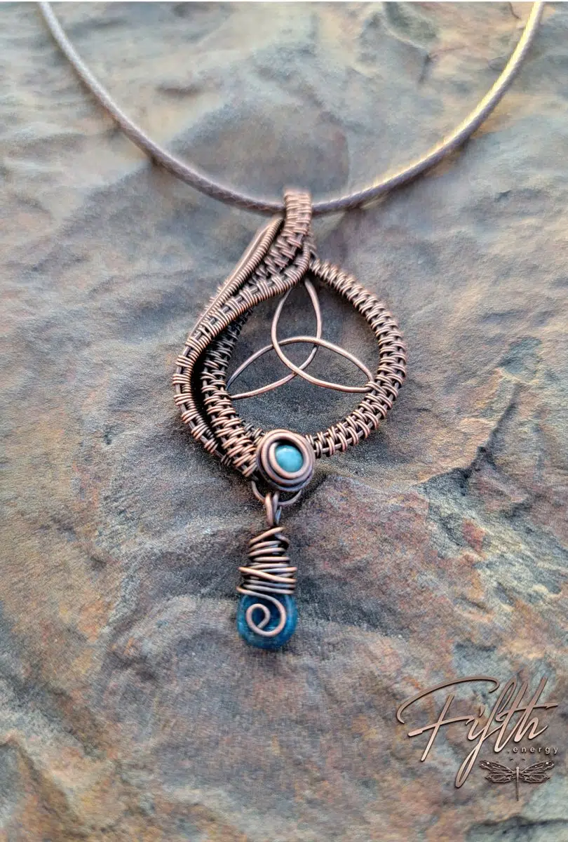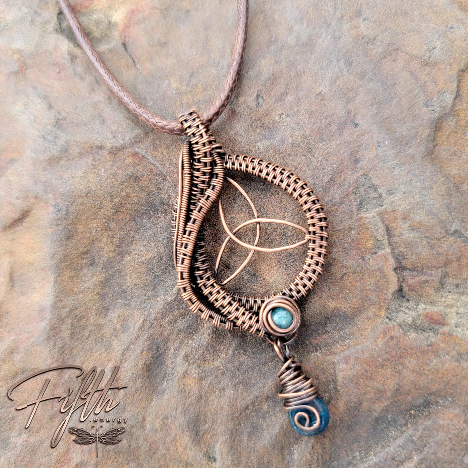 Trinity Knot Copper Apatite Necklace is handcrafted from pure raw copper made in the USA. The pure raw copper Trinity Knot necklace includes an 8x6mm teardrop Apatite Gemstone & a 4mm A Grade Apatite Gemstone.