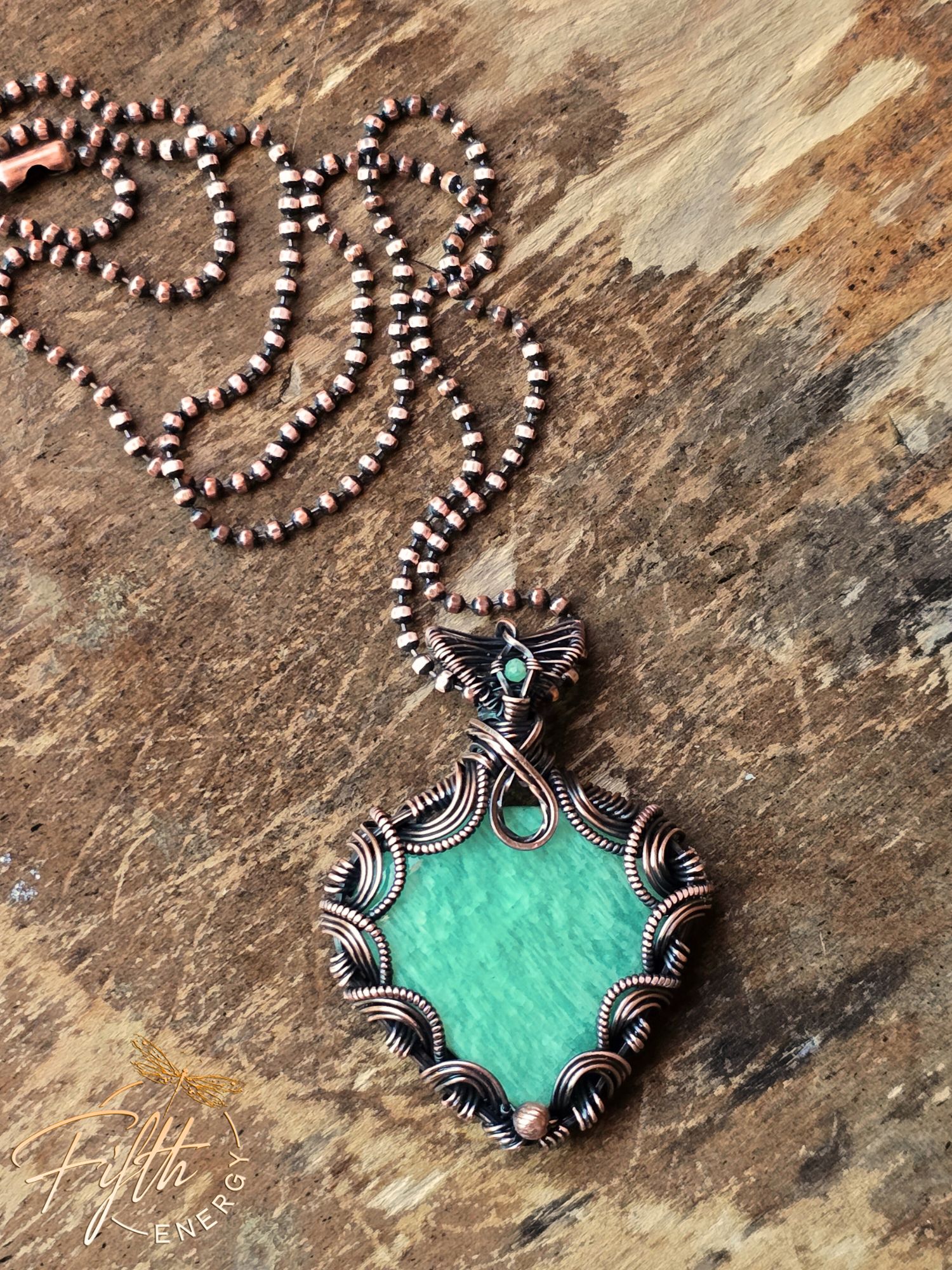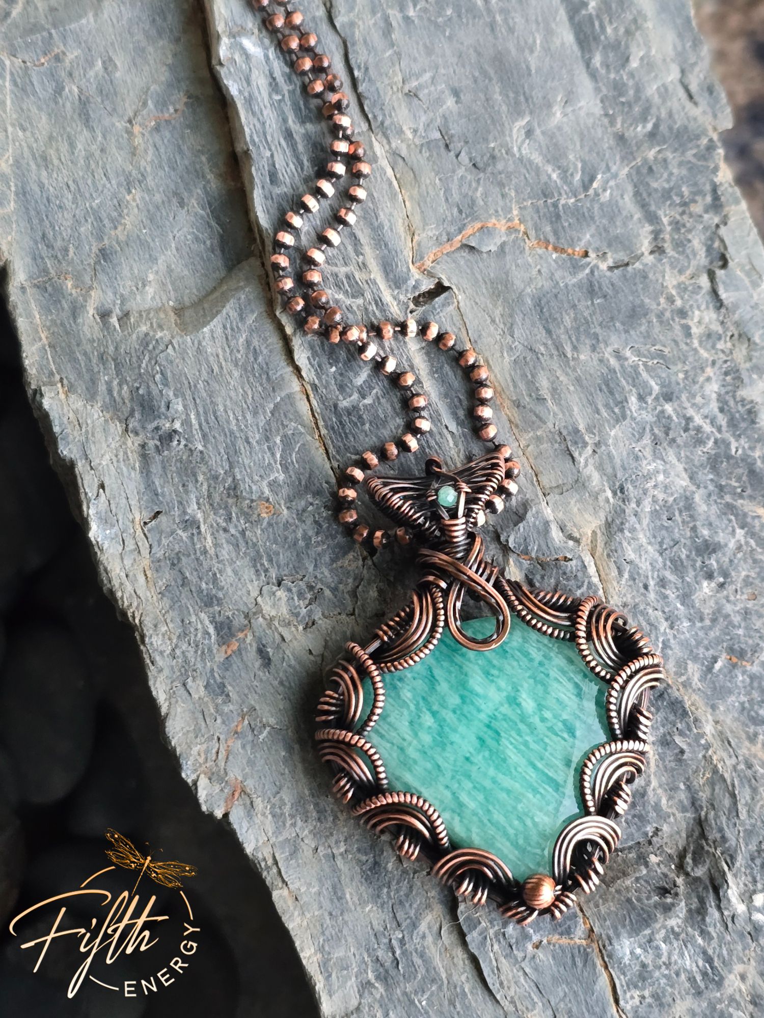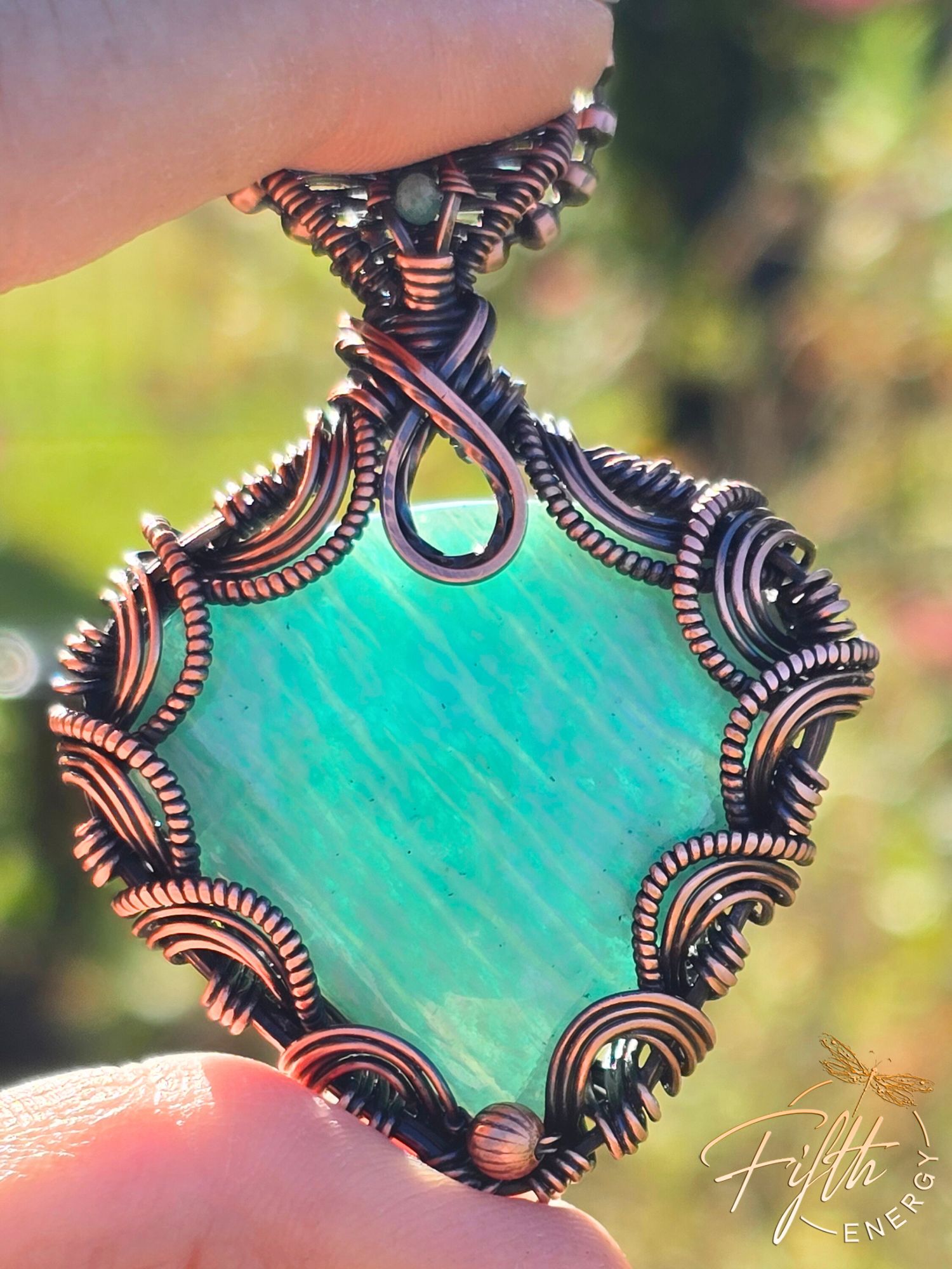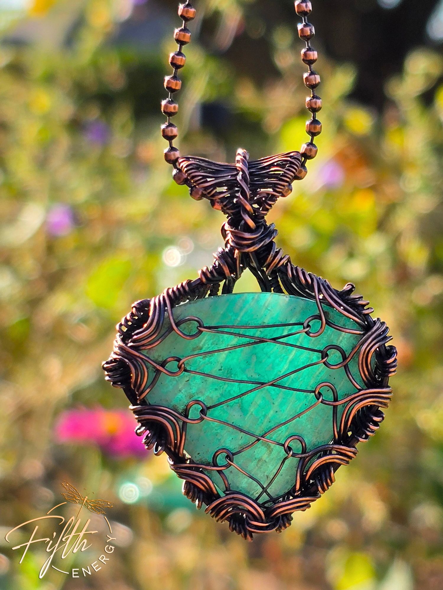 Victorian Style Amazonite Necklace. Whispers of another time live within this one-of-a-kind Amazonite pendant, its dreamy hues of green and blue-green recalling calm seas and secret gardens. The back is delicately laced like a corset—a nod to the elegance and allure of the Victorian era.